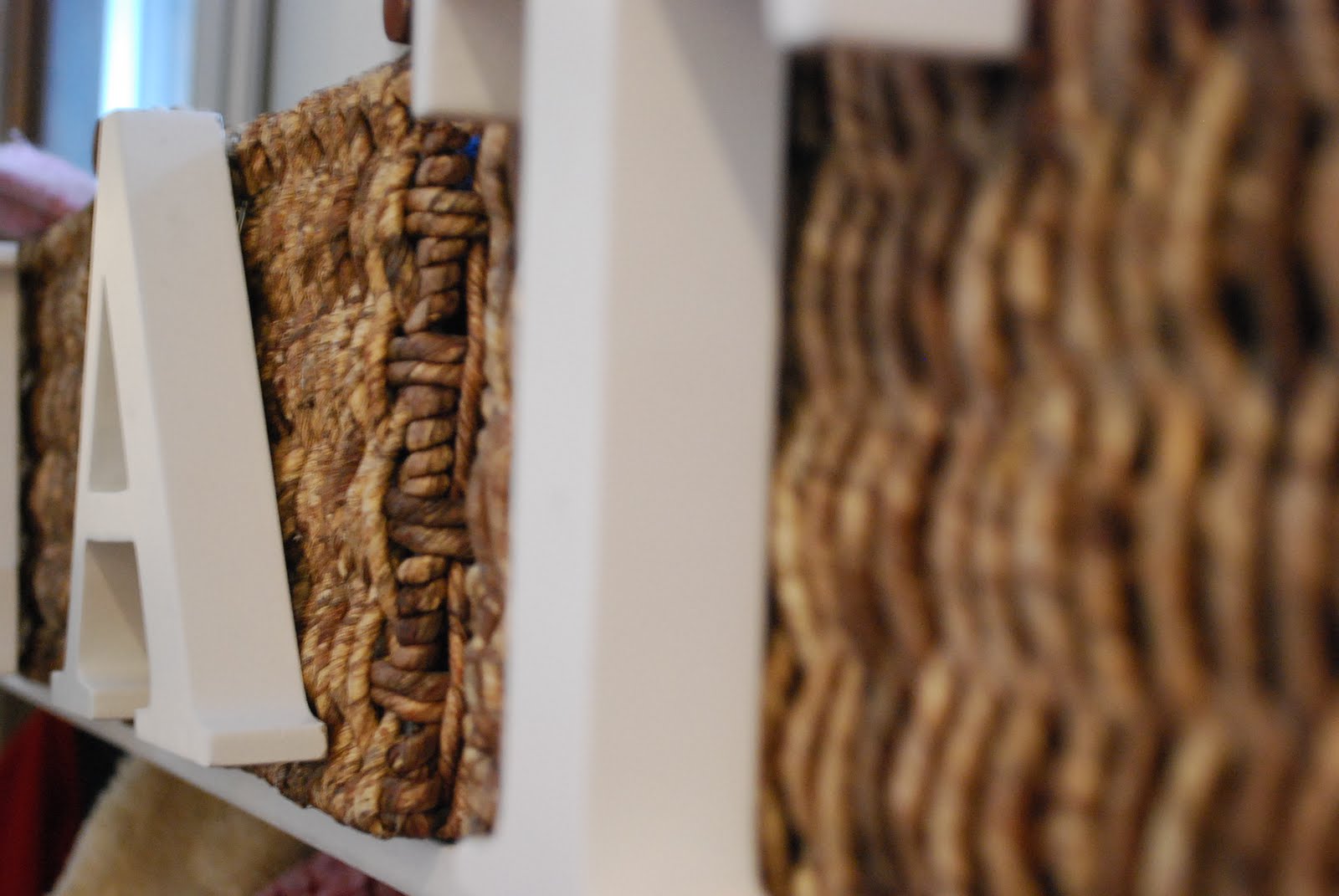 nämä puiset kirjaimet ovat etsineet paikkaansa pitkään. vihdoin keksin kiinnittää ne pipo-hanska-villasukka -koreihin. nyt toivon, että tämä kuningasidea auttaa eteistä pysymään siistinä.